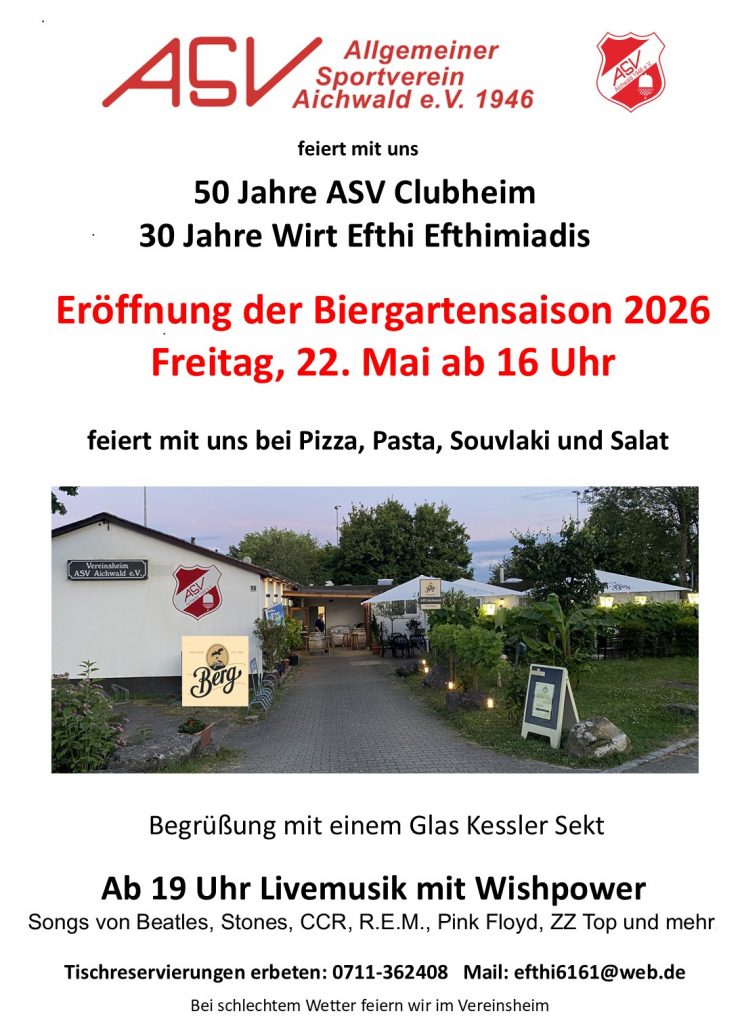 Seit 50 Jahren ist es ein fester Bestandteil des Vereinslebens und ein beliebter Treffpunkt in Aichwald. Ein weiterer Grund zur Freude ist die außergewöhnliche Kontinuität in der Bewirtschaftung des Clubheims. Seit nunmehr 30 Jahren wird es von Herrn Efthimios Efthimiadis, allen bekannt als „Efthi“, geführt. Mit viel Engagement und persönlichem Einsatz hat er das Vereinsheim in den vergangenen Jahrzehnten zu einer geschätzten Anlaufstelle entwickelt. Ein besonderes Highlight ist unser idyllischer, von Weinreben umgebener, Biergarten. Vor diesem Hintergrund möchten wir die Eröffnung der Biergartensaison am Freitag, den 22. Mai 2026 ab 16 Uhr gemeinsam mit den beiden Jubiläen feierlich begehen.